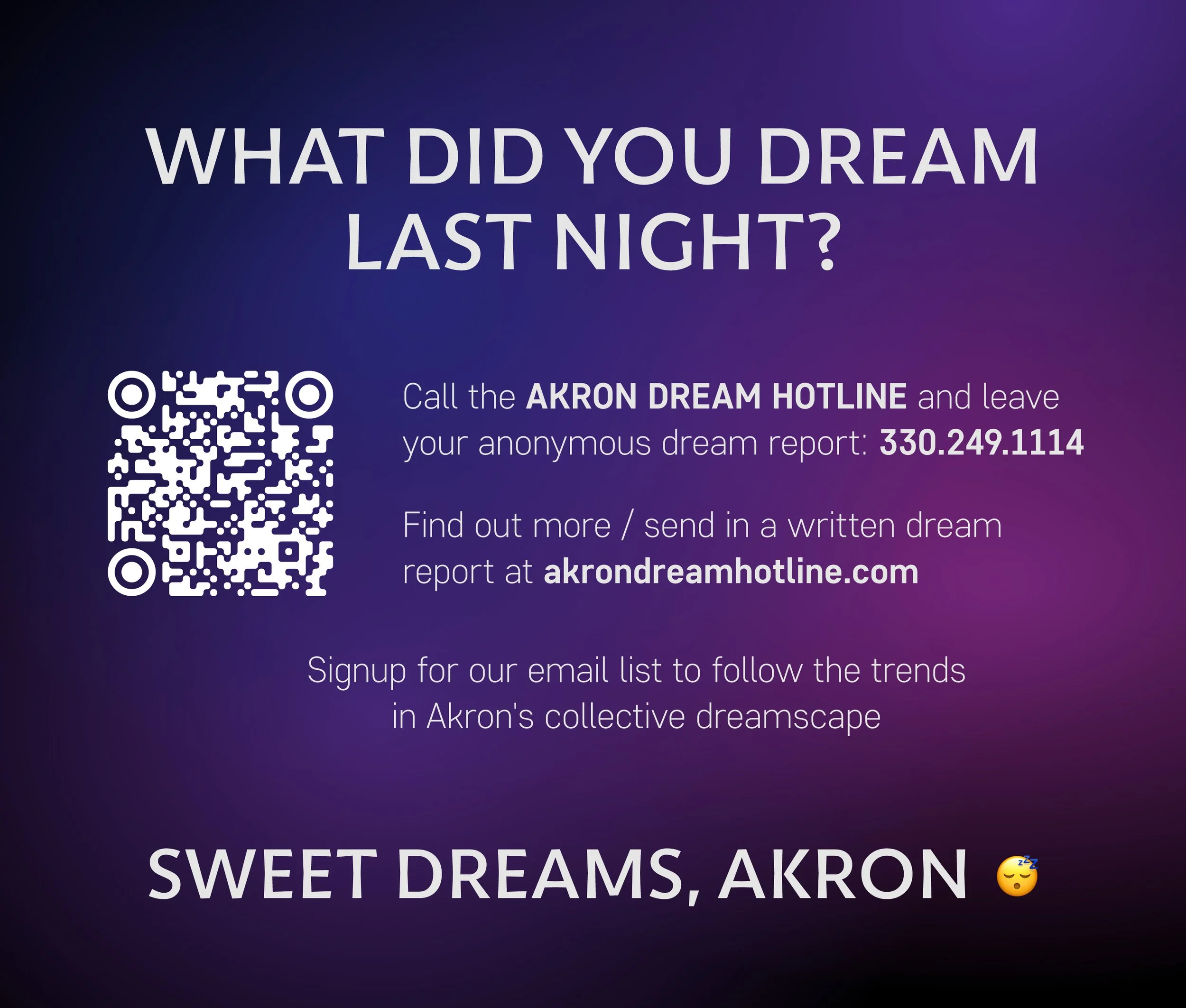 Saelyx believes that by examining our dreams, we can better understand ourselves—and, in turn, one another. By identifying patterns in the submissions, they aim to uncover a deeper answer to the central question: What are Akronites dreaming about as the city turns 200?